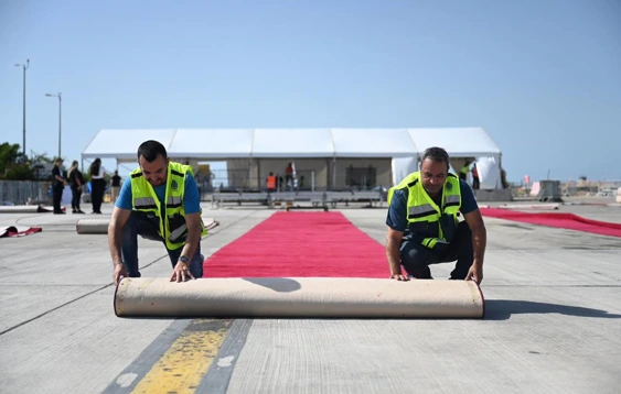 שטיח אדום, עשרות דגלים, במות ועיתונאים ימתינו לנשיא ארה"ב, דונלד טראמפ, עם נחיתתו בנמל התעופה בן גוריון