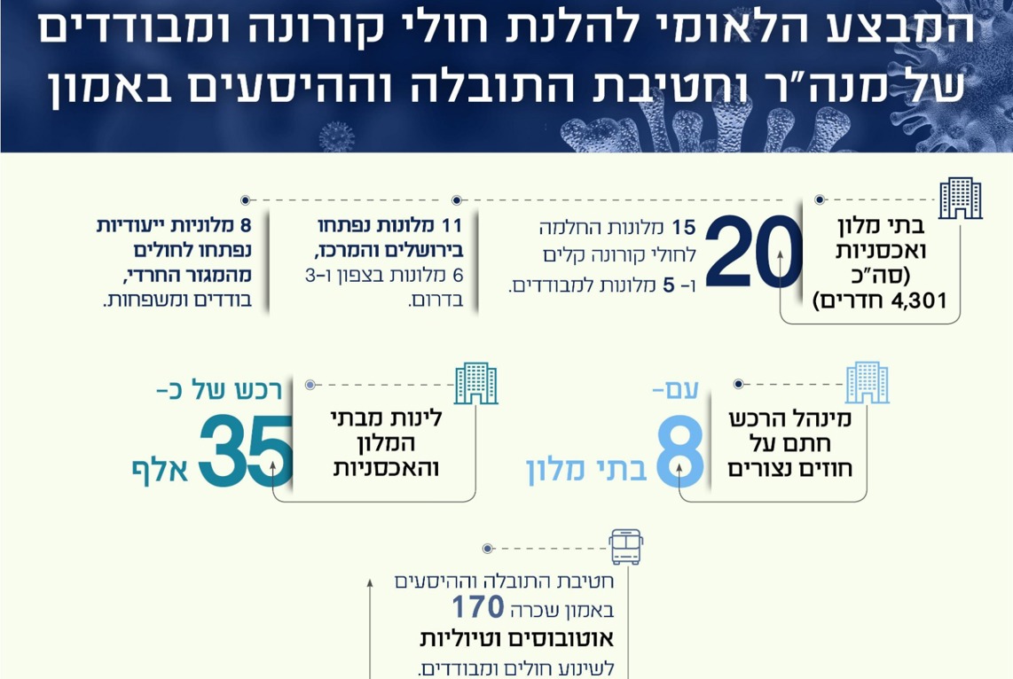 משרד הביטחון פירסם אתמול (ד') נתונים על היקף המבצע הלאומי להלנת חולי קורונה ומבודדים במלוניות, במסגרת ההתמודדות עם הגל השני של התפשטות הנגיף. בין היתר חתם מנה"ר על שמונה חוזים נצורים עם בתי מלון, שיוכלו לקלוט חולים ומבודדים נוספים. מדובר בעתודה של 960 חדרים, שניתן לפתוח בהתראה קצרה, בהתאם לקצב העלייה בתחלואה